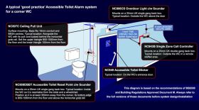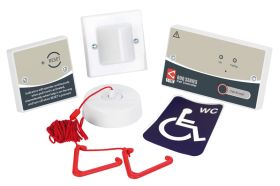 The UK's market-leading Disabled Persons Toilet Alarm kit.Includes everything required for a BS8300 clause compliant emergency assistance alarm.Attractively designed, easy to install and simple to use.Allows a distressed person to raise an alarm in the event of an emergency. To operate, the user pulls the cord of a ceiling pull to activate a light and sounder outside the WC and on the system's Call Controller.New ‘Call Accept’ functionality allows staff to send an intermittent call acknowledgment signal inside the WC to confirm help is on the way.Includes an NC943B 12V 140mA Call Controller c/w standby battery and relay, NC807C Ceiling Pull, NC806CS Overdoor Light c/w Sounder, NC809DBBT Accessible Toilet Reset Point c/w Sounder and NC949 Accessible WC Sticker.Can be wired in 4 core stranded security cable.Can also be used as a single zone emergency assistance alarm in changing rooms, solariums, interview rooms, reception areas and more.