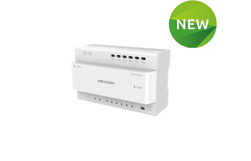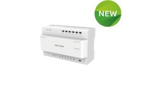 2-wire IP distributor6 2-wire cascade interfaces with device power supply2 cascade interfaces for DS-KAD706 / DS-KAD706-S8 interface indicators, 1 RJ-45 Interface, 1 Reset buttonDin rail mounting, 24VDC