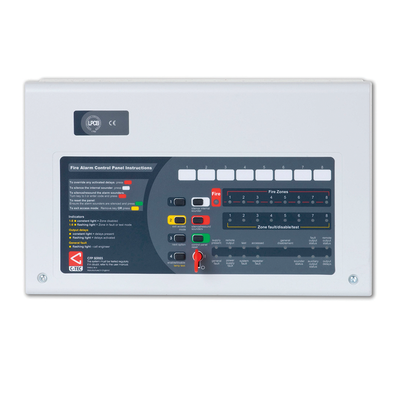 LPCB certified to EN54-2/4, C-TEC's CFP 8 zone conventional fire alarm panel offers an array of user and installer-friendly features at a very competitive price.Supplied in an attractive flush or surface mountable plastic enclosure, it includes eight detector zones, four conventional sounder circuits, class change and alert inputs, on-board fire and fault relays and combined keypad/keyswitch entry.A wide range of engineering functions are also provided including selectable zone delays, coincidence and non-latching zone facilities. Comprehensive test and fault finding facilities are also provided.Optional repeaters, relay expansion boards and EN54-13 system compliance devices are also available.