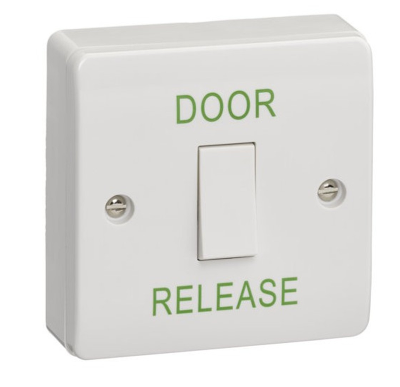 Single gang white plastic door release switch. Rocker-switch operation. Ideal for medium to high usage.FeaturesManufactured using Urea Formaldehyde, which destroys 99.9% of MRSA, E-Coli, Salmonella and Klebsiella Pneumoniae.This range of white moulded exit buttons were shown to have a 99.9% kill off rate against enveloped viruses and a 92% kill off rate against non-enveloped viruses.Single gang engraved ‘DOOR RELEASE’Custom engraving available upon requestSurface / flush mountPush-to-make / Push-to-break contacts