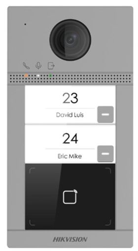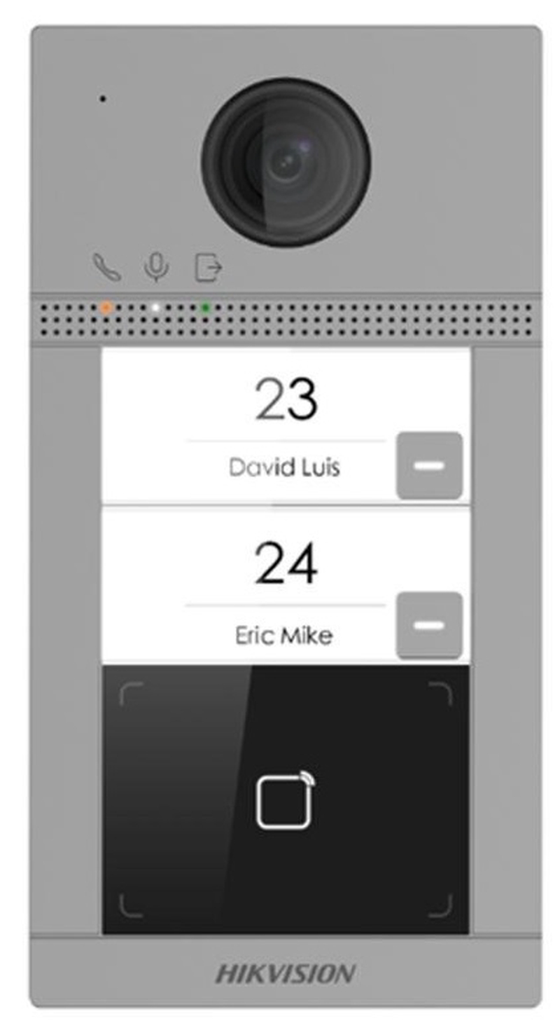 2 MP camera with IR supplementTwo nametag buttons calling design for easier callsBuilt-in card reader moduleStandard PoE power supplyIK08 & IP65 higher protection level with aluminum alloy materialConvenient Hik-Connect APP mobile control