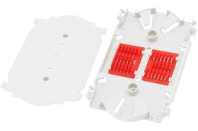 Tray for fiber optic boxes and couplers. Fiber optic splice tray is used in optical distribution boxes, terminal boxes and splice shields. Each tray comes with splice holders that secure and protect both mechanical and welded splices. The trays are designed to hold up to 24 splices, and can be mounted in patch panels or directly in switch cabinets.