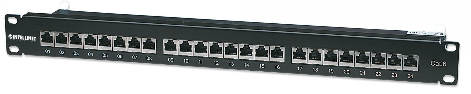 Item name | Intellinet Patch Panel, Cat6, FTP, 24-Port, 1U, Shielded, 90° Top-Entry Punch-Down Blocks, Black |