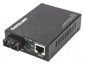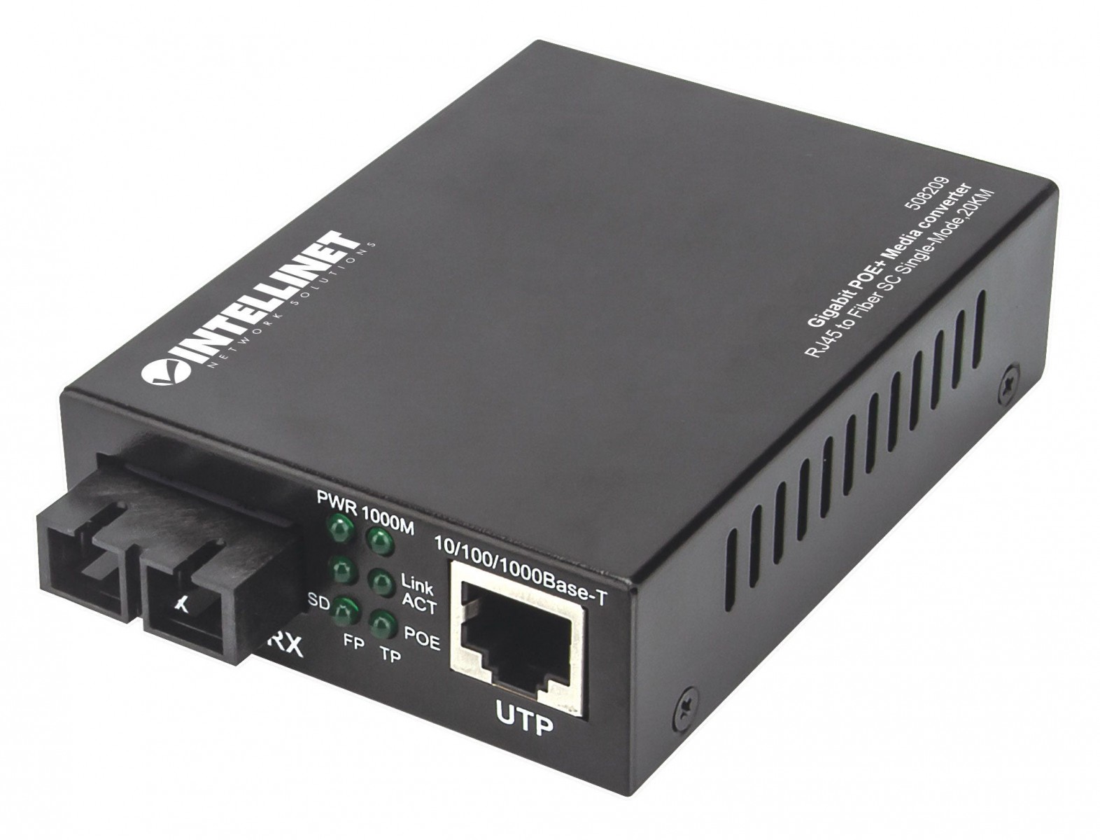 Intellinet 508209. Maximum data transfer rate: 1000 Mbit/s, Converter input interface: 1000Base-T, Converter output interface: 1000Base-LX. Maximum transfer distance: 787401.6" (20000 m), Wavelength: 1310 nm, Fiber mode structure: Single-mode. LED indicators: Activity, Link, PoE, Power, Product color: Black, Housing material: Metal. Fiber optic connector: SC, Connectivity technology: Wired. Input voltage: 56 V, Input current: 0.5 A, Total Power over Ethernet (PoE) budget: 30 W
