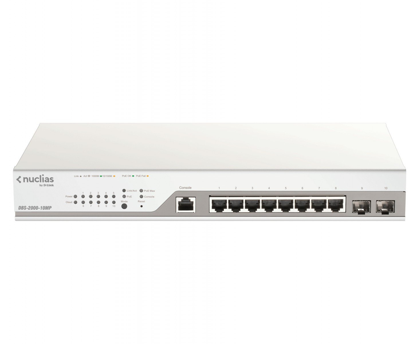 D-Link DBS-2000-10MP. Switch type: Managed, Switch layer: L2. Basic switching RJ-45 Ethernet ports type: Gigabit Ethernet (10/100/1000), Basic switching RJ-45 Ethernet ports quantity: 8, Console port: RJ-45. Switching capacity: 20 Gbit/s. Networking standards: IEEE 802.3ad, IEEE 802.3at. Power over Ethernet (PoE). Rack mounting