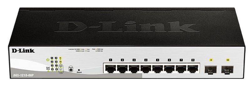 D-Link DGS-1210-08P. Switch type: Managed, Switch layer: L2. Basic switching RJ-45 Ethernet ports type: Gigabit Ethernet (10/100/1000), Basic switching RJ-45 Ethernet ports quantity: 8. Full duplex. MAC address table: 16000 entries, Switching capacity: 20 Gbit/s. Networking standards: IEEE 802.1D, IEEE 802.1w, IEEE 802.3ad, IEEE 802.3af. Power over Ethernet (PoE). Rack mounting