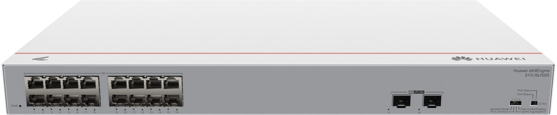 HUAWEI eKit S110 Series S110-16LP2SR. Switch type: Unmanaged, Switch layer: L2. Basic switching RJ-45 Ethernet ports type: Gigabit Ethernet (10/100/1000), Basic switching RJ-45 Ethernet ports quantity: 16. MAC address table: 8000 entries, Switching capacity: 36 Gbit/s. Power over Ethernet (PoE). Rack mounting, Form factor: 1U