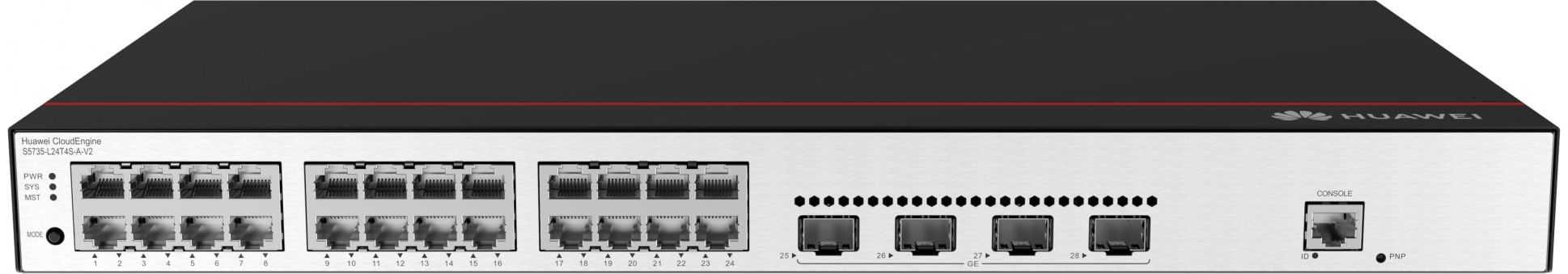 Huawei CloudEngine S5735-L24T4S-A-V2. Switch type: Managed, Switch layer: L3. Basic switching RJ-45 Ethernet ports type: Gigabit Ethernet (10/100/1000), Basic switching RJ-45 Ethernet ports quantity: 24, Console port: RJ-45. Switching capacity: 56 Gbit/s. Networking standards: IEEE 802.1x. Rack mounting, Form factor: 1U