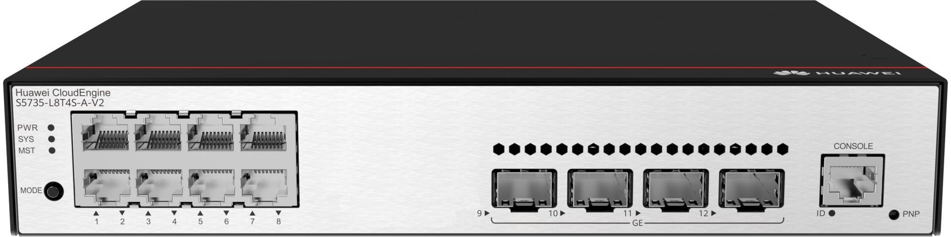 Huawei CloudEngine S5735-L8T4S-A-V2. Switch type: Managed, Switch layer: L3. Basic switching RJ-45 Ethernet ports type: Gigabit Ethernet (10/100/1000), Basic switching RJ-45 Ethernet ports quantity: 8, Console port: RJ-45. Switching capacity: 24 Gbit/s. Networking standards: IEEE 802.1x. Rack mounting, Form factor: 1U