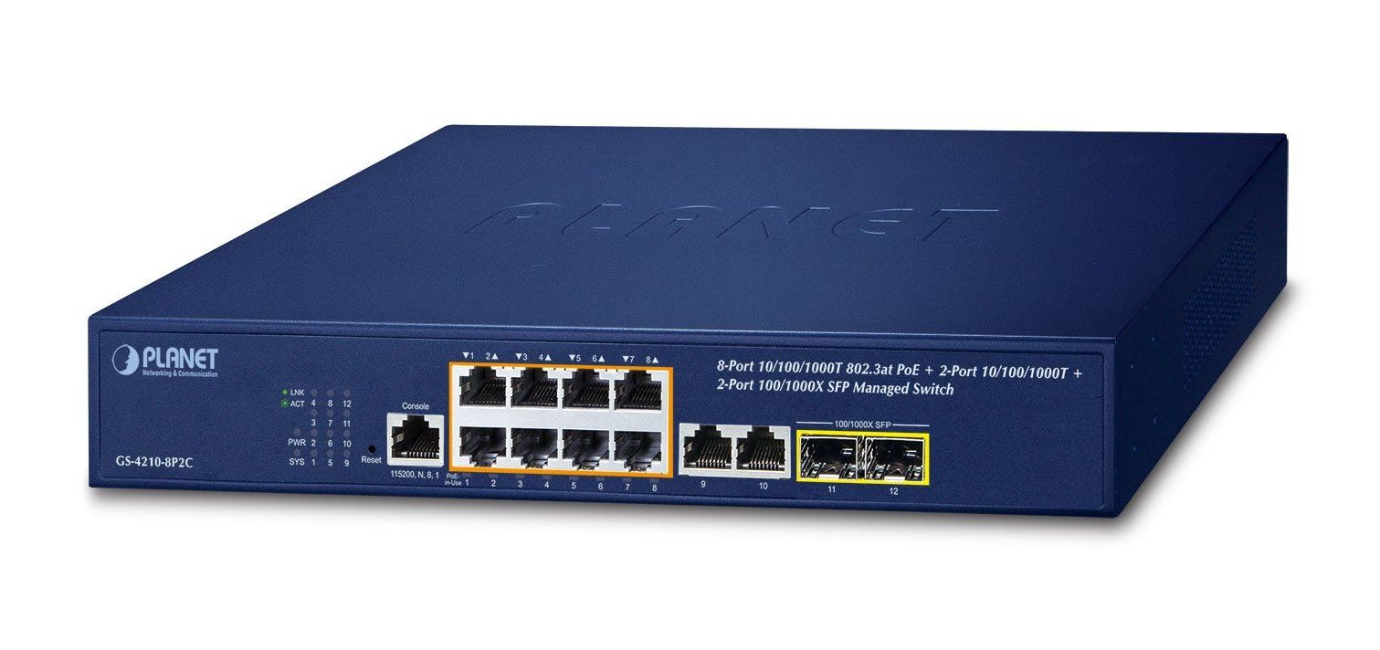 Item name | Planet GS-4210-8P2C IPv4/IPv6, 8-Port Managed 802.3at POE+ Gigabit Ethernet Switch + 2-Port 10/100/1000Mbps RJ45 + 2-Port 100/1000X SFP (120W PoE Budget, 250m |