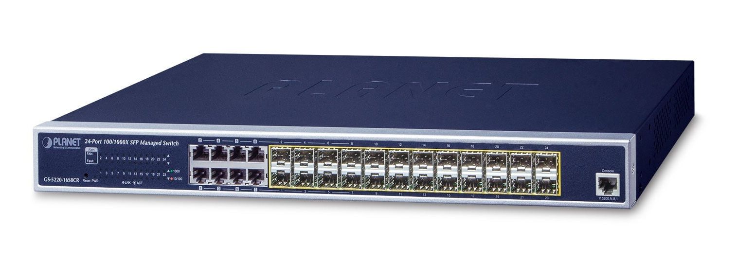 Item name | Planet GS-5220-16S8CR L2+/L4 24-Port 100/1000X SFP with 8 Shared TP Managed Switches, with Hardware Layer3 IPv4/IPv6 Static Routing, W/ 48V Redundant Power |