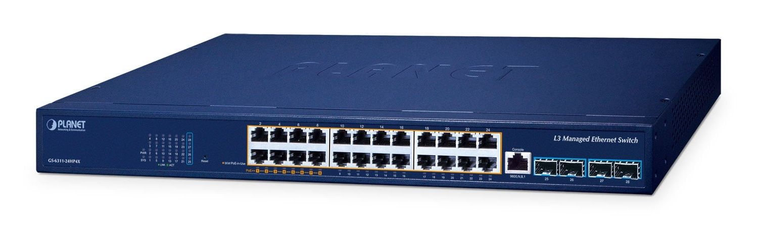 PLANET GS-6311-24HP4X. Switch type: Managed, Switch layer: L3. Basic switching RJ-45 Ethernet ports type: Gigabit Ethernet (10/100/1000), Basic switching RJ-45 Ethernet ports quantity: 24, Installed SFP+ modules quantity: 4. Full duplex. MAC address table: 32000 entries, Switching capacity: 128 Gbit/s. Networking standards: IEEE 802.1D, IEEE 802.1Q, IEEE 802.1ab, IEEE 802.1ag, IEEE 802.1p, IEEE 802.1s, IEEE 802.1w, IEEE.... Power over Ethernet (PoE)