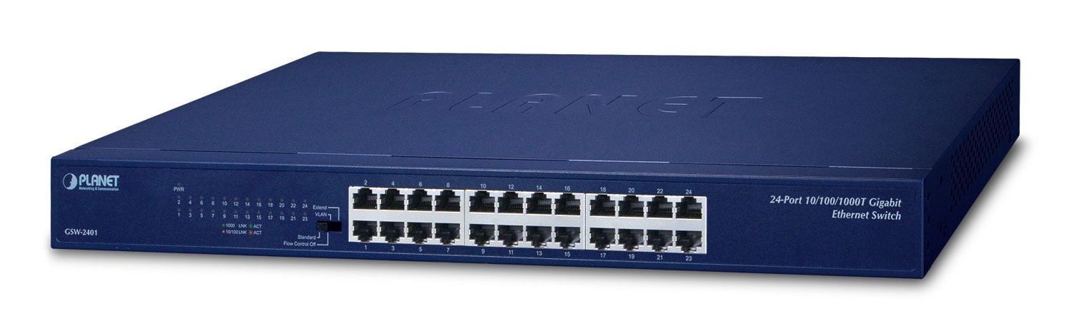 PLANET GSW-2401. Switch type: Unmanaged. Basic switching RJ-45 Ethernet ports type: Gigabit Ethernet (10/100/1000), Basic switching RJ-45 Ethernet ports quantity: 24. Full duplex. MAC address table: 8000 entries, Switching capacity: 48 Gbit/s. Networking standards: IEEE 802.3, IEEE 802.3ab, IEEE 802.3az, IEEE 802.3u, IEEE 802.3x. Power connector: DC-in jack. Rack mounting, Form factor: 1U