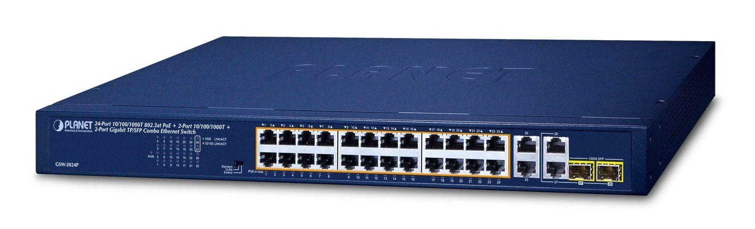 Item name | Planet GSW-2824P 24-Port 10/100/1000T 802.3at PoE + 2-Port 10/100/1000T + 2-Port Gigabit TP/SFP Combo Ethernet Switch (250W PoE Budget, Standard/VLAN/Extend mo |
