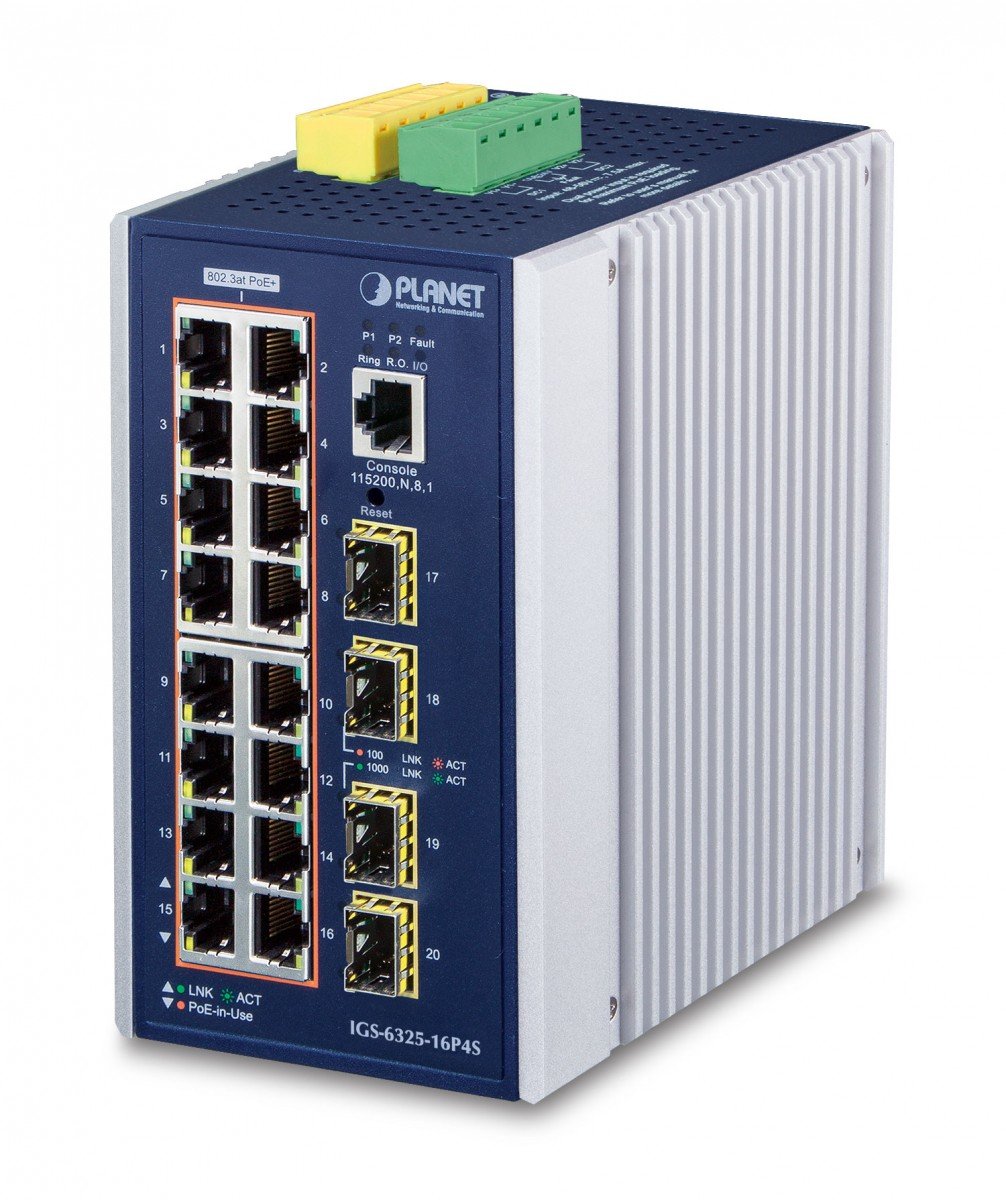 Item name | Planet IGS-6325-16P4S IP30 DIN-rail Industrial L3 16-Port 10/100/1000T 802.3at PoE + 4-port 1G/2.5G SFP Full Managed Switch (-40 to 75 C, dual redundant power i |