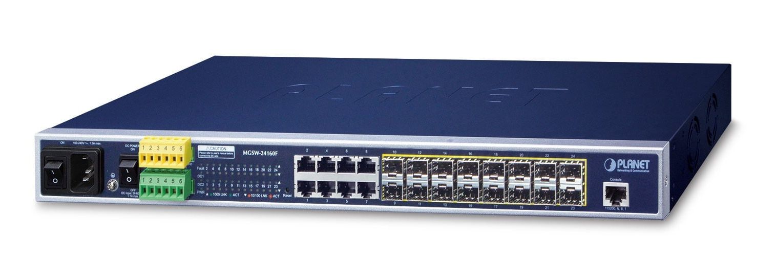 Item name | Planet MGSW-24160F 16-Port 100/1000Base-X SFP + 8-Port 10/100/1000Base-T L2/L4 Managed Metro Ethernet Switch (AC+2 DC, DIDO) |