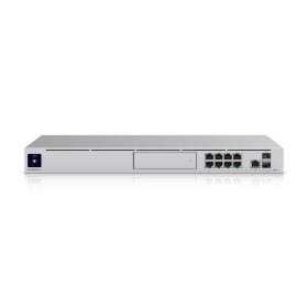The UDM Pro is an all-in-one networking console that runs every UniFi OS application, like Network and Protect. It features a built-in security gateway, 10G SFP+ WAN support, an 8-port Gigabit switch, and network video recorder that supports compatible 3.5" hard disk drives (HDDs).