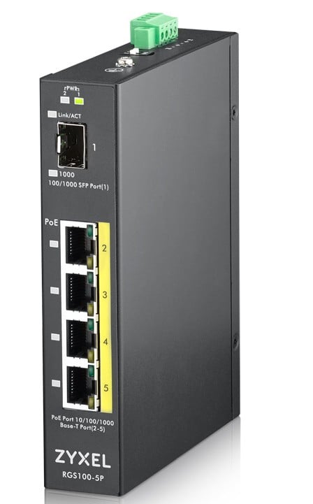 Zyxel RGS100-5P. Switch type: Unmanaged, Switch layer: L2. Basic switching RJ-45 Ethernet ports type: Gigabit Ethernet (10/100/1000), Basic switching RJ-45 Ethernet ports quantity: 4. Full duplex. MAC address table: 2000 entries, Switching capacity: 10 Gbit/s. Networking standards: IEEE 802.1p, IEEE 802.3, IEEE 802.3ab, IEEE 802.3af, IEEE 802.3at, IEEE 802.3u, IEEE 802.3x, IEEE.... DC input voltage: 12 - 58 V. Power over Ethernet (PoE). Wall mountable, Rack mounting