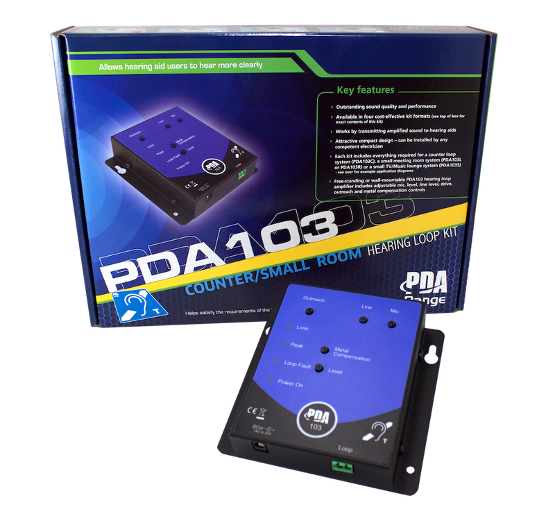 Everything you need to create a high-quality fixed hearing loop system for a counter, desktop or ticket booth.Ideal for banks, post offices, reception desks, ticket offices and any other area requiring person to person coverage.PDA103 amplifier includes a 3.5mm microphone input (for use with the AMT microphone supplied), a line level input and an ‘outreach’ socketMetal compensation control helps improve intelligibility in rooms with high metal content.Adjustable mic, line level and ‘outreach’ controls.Drive (level) control allows the amplifier’s output stage to be set-up to suit the exact characteristics of the application.State-of-the-art audio processor features an automatic gain control which compensates for poor microphone techniques and helps suppress loud noises, hisses & clicksLimit, Peak, Loop Fault and Power On indicatorsDesigned to be wall-mounted using the keyholes providedExceeds the requirements of BS7594 & EN60118-4 when correctly installed