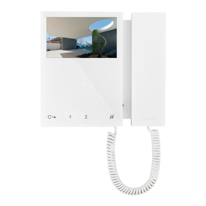 Wall-mounted colour monitor with 4.3" 16:9 screen and handset. Allows brightness and contrast control, plus adjustment of the volume of the ringtone, which can be customised with a choice of different melodies. Equipped as standard with 4 soft touch buttons for door-opening, self activation, switchboard call, silent mode and with door status indicator LEDs. Manages floor door calls as standard. Option of adding 4 additional buttons with accessory art. 6733W. Complete with 2 x 8-position DIP-switches for user code programming and button programming. Includes wall-mounting or residential series box backplate and riser distribution terminal art. 1214/2C. The monitor can only be used in 2-wire Simplebus2 systems. Dimensions: 175x160x22mm.