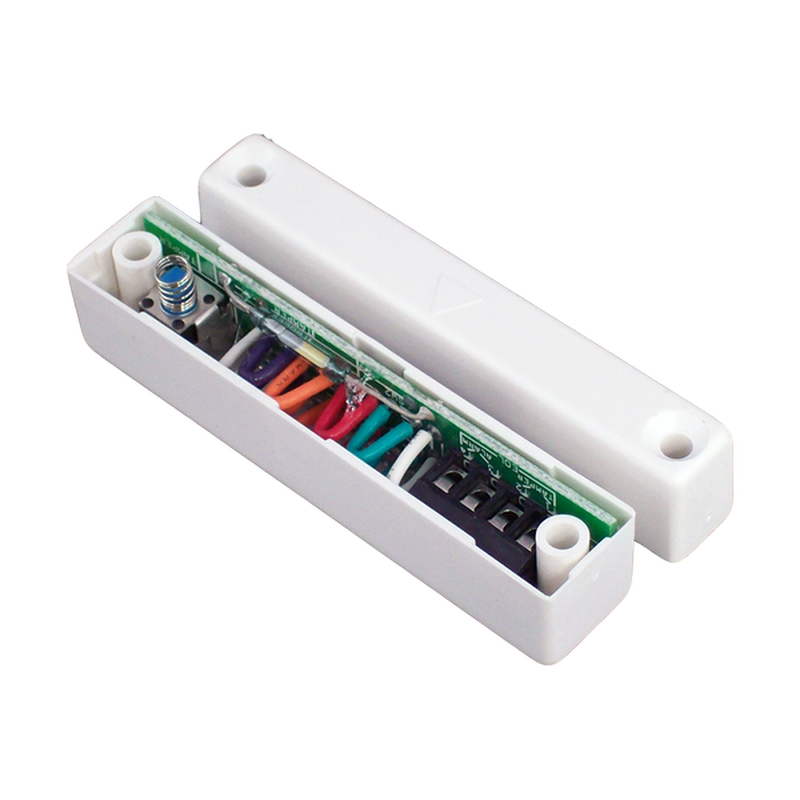 This compact surface mounted magnetic contact can be used in most security systems up to and including grade 3 as specified in EN50131-1: 2006 and is certified to EN50131-2-6:2008 and environmental class II (for use indoors) by Kiwa FSS. It operates as a normally closed circuit going open when the magnet housing is moved away from the contact housing. This contact can be used on windows and doors to detect the unauthorised entry of an intruder.The contact is tamper protected against removal from its mounting surface. Additionally there is a magnetic interference detection circuit for signalling the proximity of a magnet, which typically would be used by an intruder trying to inhibit the performance of the contact.4 TerminalsMicroswitch tamperSelectable end of line resistorCan use own resistorsAvailable in white or brownCan be fitted in double pole systemsCan be used on double door configurationMagnetic Interference DetectionContact spacers available