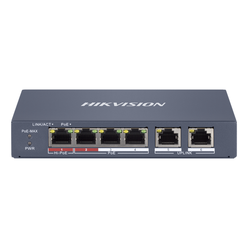 4 × 100 Mbps PoE RJ45 ports, 2 × 100 Mbps network RJ45 portsIEEE 802.3at/af/bt standard for PoE portsNetwork topology management, and alarm push6 KV surge protection for PoE portsUp to 300 m long-range transmissionAF/AT camera can reach up to 300 m in extend mode