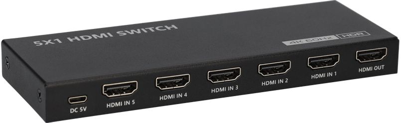 Input port: HDMI×5.Output port: HDMI×1.HDMI2.0 and HDCP2.2 compliant.Support resolution up to ultra-HD 4Kx2K@60Hz.Supports highest bandwidth up to 18Gpbs.Supports HDR, Support 3D.Switch by IR remote control or switch button, power by micro.USB cable.