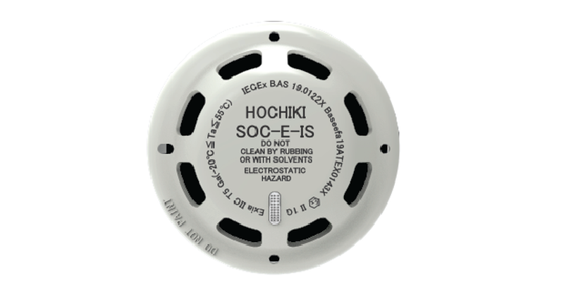 SOC-E-IS is a Photoelectric Smoke Detector, which is fully compatible with the majority of existing Conventional systems. The SOC-E-IS incorporates Hochiki’s unique High-Performance photoelectric smoke chamber removing the need to use Ionisation Detectors in the majority of applications.‘ASWV’ Drift Compensation technology is incorporated to ensure the Detector is operating at its optimum sensitivity and therefore reducing potential false alarms. If the contamination limit is exceeded then the integral red LED will flash once every three seconds to give a visual warning. The smoke chamber is easily removed or replaced for cleaning and utilizes a unique baffle design that allows smoke to enter the chamber whilst keeping out ambient light.Removable, High-Performance chamberAutomatic Sensitivity Window Verification (ASWV) – Drift Compensation TechnologyWide voltage range (9.5 ~ 30 VDC)ATEX Classification to: Ex ia IIC T5 Ga (-20°C ≤ Ta ≤ +55°C)Approved by LPCB & VdSOrdering codes: SOC-E-IS - Ivory | SOC-E-IS(WHT) - WhiteCompatible Base: YBN-R/4(IS)