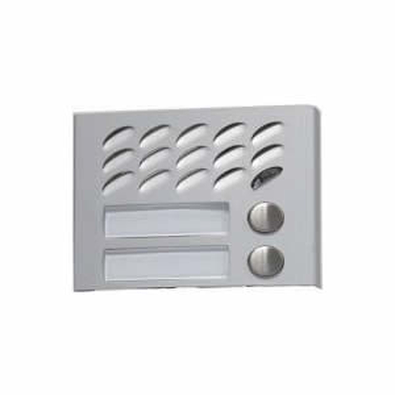 Element of the modular Mody push button series. With 2 call buttons and suitable for MD30 electric door speaker; depending on the different cases, it is wall-mounted through back box, module frame, rain shelter and it can be joint to the various button modules of the same series. 1 row.