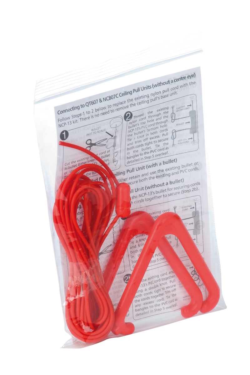 A BS8300 compliant anti-bacterial wipe-clean pull cord pack suitable for use with C-TEC's Quantec and 800 Series ceiling pull units.Contains 3m of red vinyl encapsulated cord, two triangular bangles and a red fixing bullet.Cord has integral properties that can help prevent the spread of infections such as MRSA, e.coli, c.diff, S Aureus and the Norovirus.Ideal for use in hospitals, nursing and care homes, doctors’ surgeries, clinics and any other area where infection control is imperative.A simple and cost-effective means of updating existing ceiling pulls to comply with the stringent hygiene regulations of many health authorities and inspection bodies.Easy to clean using a clean cloth and mild detergent.Also compatible with many other manufacturers' ceiling pull units.Replacement nylon pull cord packs also available (part no. NCP-12)