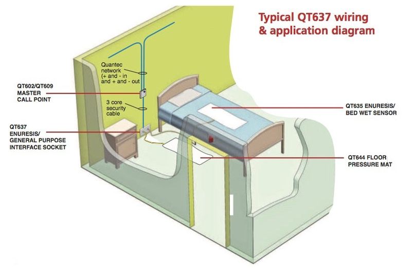 Allows bed wet sensors, floor pressure mats and bed/chair exit sensors to be easily interfaced to a Quantec addressable call system.Includes two 6.35mm remote jack sockets - one for use with a QT635 enuresis/bed wet sensor and one that will accept a floor pressure mat (QT644), bed exit mat (QT633) or chair exit mat (QT634).Onboard battery/isolation circuit ensures compliance with all relevant UK medical directives.Connects to Quantec via the ancillary input on a Quantec master call point or a QT630 dementia care controller.Can be programmed to generate a ‘standard’, ’help required’ or ‘emergency’ call on activation via a QT423 configurator at the master call point.Includes a battery test button and low battery/enuresis active indicatorsSupplied on a double gang plate typically located at floor level.Requires a PP3 battery.