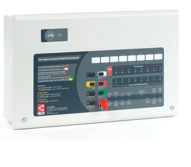 LPCB certified to EN54-2/4, C-TEC’s CFP two-wire 8 zone AlarmSense fire panel is designed to work with Apollo’s AlarmSense range of detectors, call points, sounders and visual indicators.Most conventional fire systems work with two pairs of wires per zone: one pair for detection devices; the other for alarm devices. By using different voltage bands for quiescent and alarm states, AlarmSense components can be connected to the same pair of supply wires. This reliable technology takes all of the complexity out of fire system design, leading to quicker, more flexible installation and around a 20-25% reduction of labour over a standard four wire system.The CFP708-2 includes four AlarmSense zones, four conventional sounder circuits, class change & alert inputs and on-board fire & fault relays. A wide range of engineering functions are also provided including selectable zone delays, coincidence and non-latching zone facilities.Optional repeaters and relay expansion boards also available.Third-party certified to EN54 parts 2 and 4 by the Loss Prevention Certification Board (LPCB).Intuitive user-friendly interface with colour-coded buttons and combined keypad/keyswitch entry.Manufactured by C-TEC in the UK.Eight AlarmSense zone circuits – compatible with Apollo’s AlarmSense detectors, call points, sounders and visual indicators.Four conventional sounder circuits.Integral 1.5A EN54-4/A2 compliant switch mode PSU.Wide range of engineering functions including zone test, coincidence, zone delay and non-latching zones.Two on-board relays (Fire and Fault).Two open-collector outputs (Remote and Reset).‘Class change’ and alert inputs.Installer-friendly design.Attractive flush or surface mountable plastic lid and enclosure – no bezel required.Low 25mA quiescent current.Multiple indicators.System expansion connections provided for up to eight two-wire repeaters (one CFP761 network card required per system).Space for two x 12V 3.3Ah VRLA batteries.