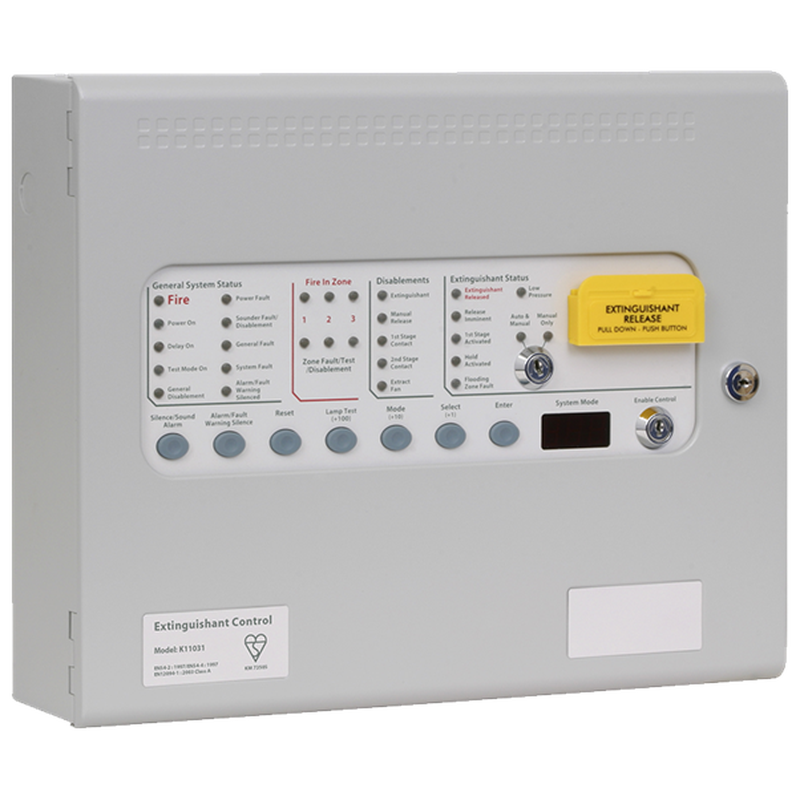 Single area extinguishing control panel with 3 conventional detection zonesExtinguishing status indicatorsDual action manual extinguishing release controlAuto/Manual keyswitchIntegral 3 Amp power supply 230V AC inputSpace for 2 x 12V 7Ah SLA batteriesSurface Mount M2 enclosure 385mm (W) x 310mm (H) x 90mm (D)
