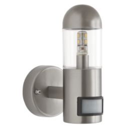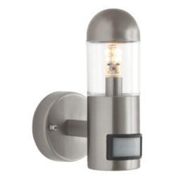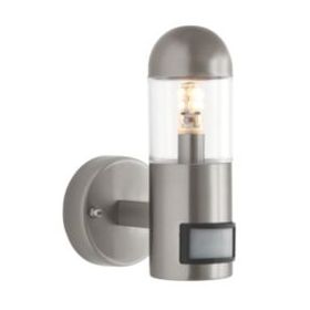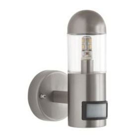 Contemporary, brushed stainless steel wall light with domed top and PIR motion sensor. Clear polycarbonate shade. Fixed.
