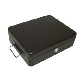 Strong, black powder-coated steel box with secure lock and carry handle. Suitable for folders and documents. Supplied with 2 keys.