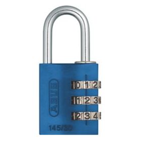 Combination padlock with a resettable 3-digit code. Solid aluminium blue body with a 5mm diameter shackle.