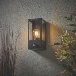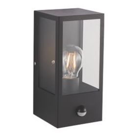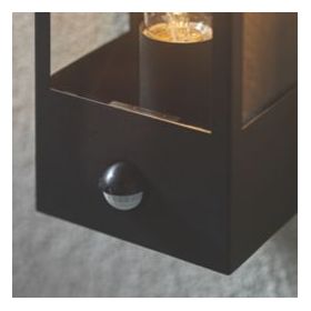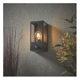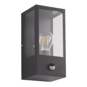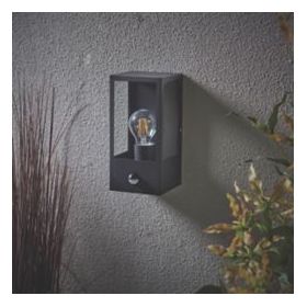 Contemporary box style wall light, perfect for adding a modern look to any outdoor space. Built-in manual PIR override.