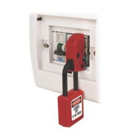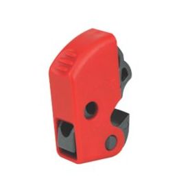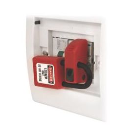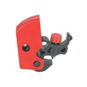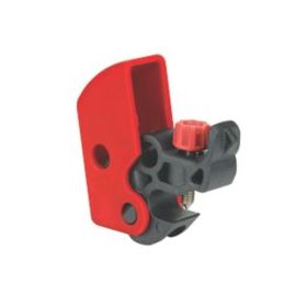 Universal miniature circuit breaker lockout device locks miniature ISO / DIN pin-out circuit breakers. Features a thumb turn dial screw for easy attachment, with no tools required. The dial is inaccessible in the locked position to prevent removal. Can be applied horizontally or vertically, and design allows device to be mounted side-by-side on adjacent breakers. Compatible with all Master Lock and American Lock safety padlocks and lockout hasps.