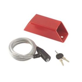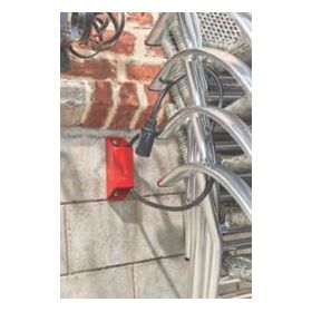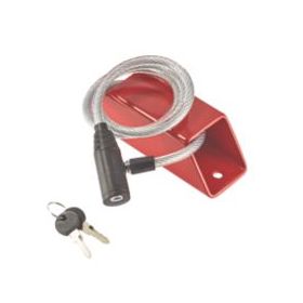 Heavy duty, red metal wall mount lock anchor. Ideal for securing motorbikes, scooters, bicycles, trailers and other equipment. Supplied with 1m anti-theft cable, padlock and 2 keys.
