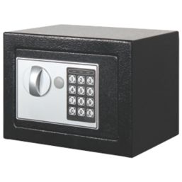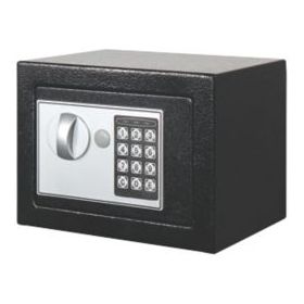 Steel construction. Easy to install. Opens with a 3-8 digit code. Hardened steel plate to resist drilling. Includes override key and test button. Batteries sold separately.