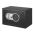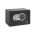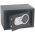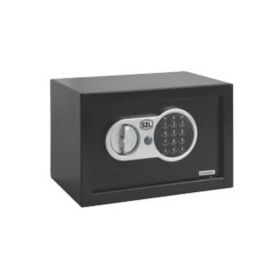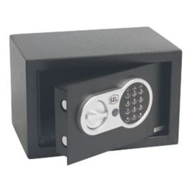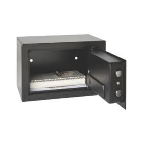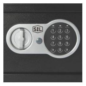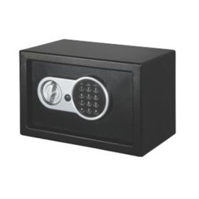 Steel construction with plastic panel. Opens with a 3-8 digit code. Different coloured lights indicate when the door is open, when the battery is low and as a warning message. Includes override key and protective floor mat.