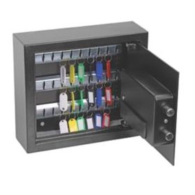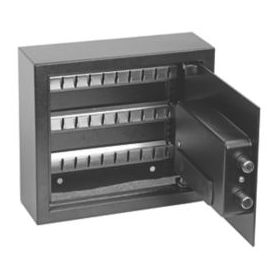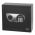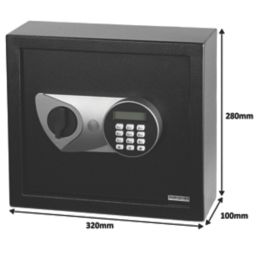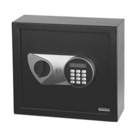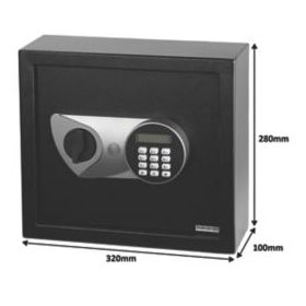 Steel construction with plastic panel. Opens with a 3-8 digit code. Coloured indicator lights for open door, low battery and warning message on the integrated LCD screen.