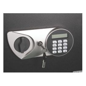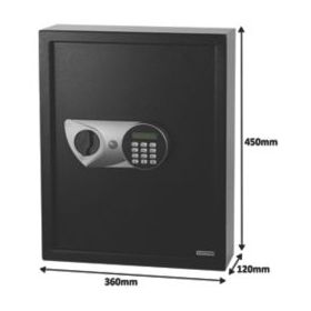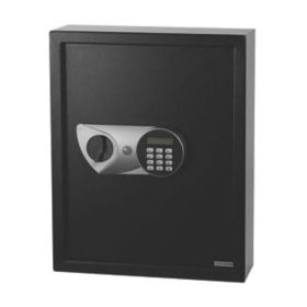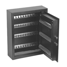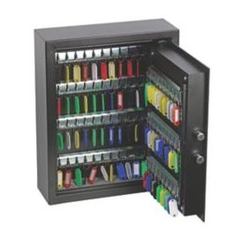 Durable steel construction. Combination key cabinet with the capacity to hold 71 keys. Opens with a 3-8 digit code.