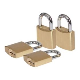 Pack of 4 padlocks with weather-resistant brass body, hardened steel shackle and corrosion-resistant inner. 8 brass keys supplied.
