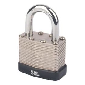 Laminated, water-resistant hardened steel body and shackle with PVC bumper.