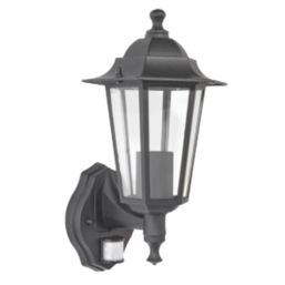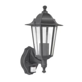 PIR lantern with traditional matt black finish. Die-cast aluminium and glass construction.