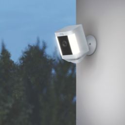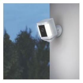 Spotlight camera with adjustable viewing angle. Features colour night vision, customisable motion detection, and a pair of bright, motion-activated lights. Ideal for use in out-of-sight areas. Includes quick release battery pack.