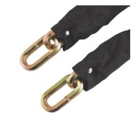 Weather-resistant, zinc-plated, hardened steel chain. Hexagonal shackle for increased security. Oxford cloth cover prevents scratching. Suitable for many applications such as securing bikes and motorcycles.