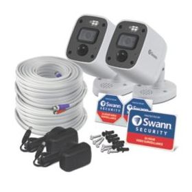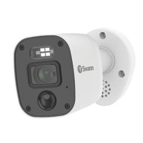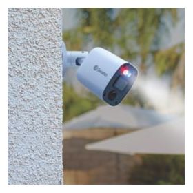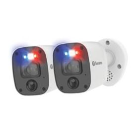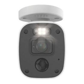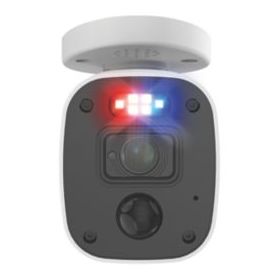 Security camera with red and blue flashing lights, bright sensor spotlights and sirens to prevent crime. Night2Day allows colour video at any hour, up to 10m. Powerful night vision up to 40m. 4K ultra HD video for detailed viewing, can be watched live when connected to a CCTV kit and smart device. Features heat and motion detection and microphone for audio capture.
