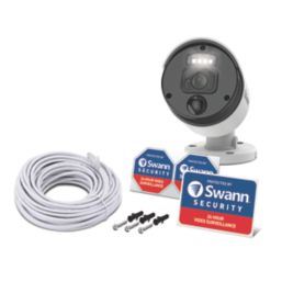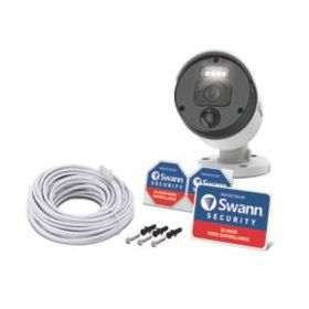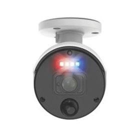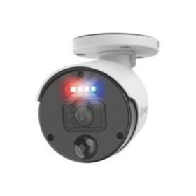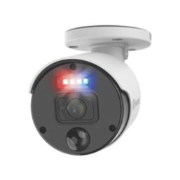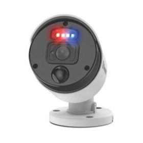 Security camera with red and blue flashing lights, bright sensor spotlights and sirens to prevent crime. Night2Day allows colour video at any hour, up 10m. Powerful night vision up to 40m. 4K ready HD video, can be viewed using Swann Security app, with mobile alert capability. Features heat and motion detection and microphone for audio capture.
